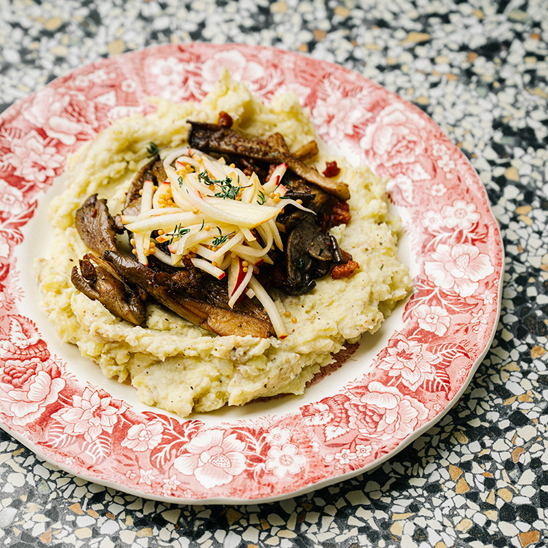 Craving a warming dish full of rich flavours and autumn aromas? This mash with parsnip, roasted garlic, oyster mushrooms and crispy pancetta brings the season straight to your plate. The tangy pickled apple strips add a surprising freshness and finish the dish perfectly.