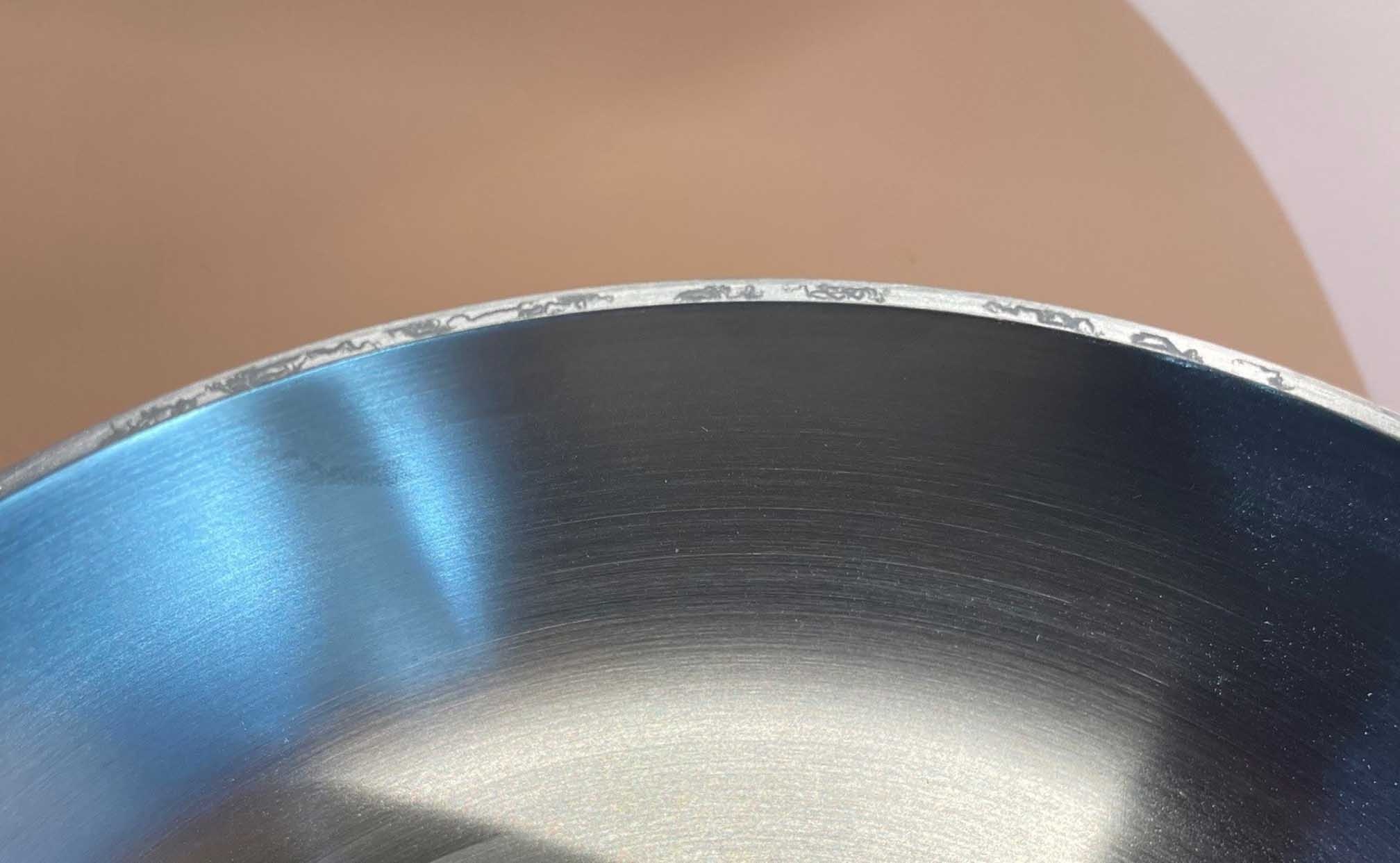 On these pans, the rim is finished straight and open, meaning a small part of the aluminium core is visible at the cut edge. Aluminium naturally reacts with air and moisture, forming a thin protective layer. In some cases, this becomes visible as a dull, slightly greyish or whitish discolouration on the rim. This is almost always purely cosmetic and has no effect on the performance, food safety or lifespan of the pan.
