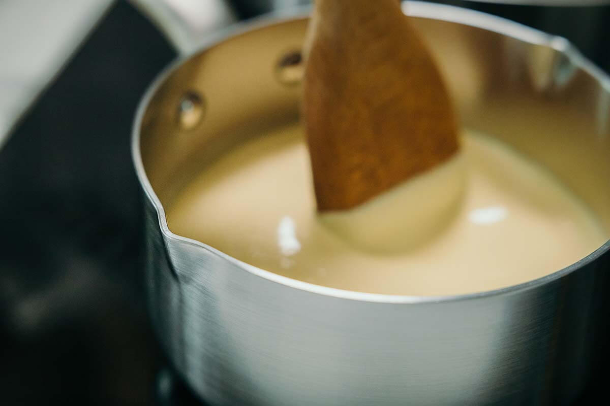 Retire le bol du feu et ajoute le beurre fondu très lentement, en filet, tout en continuant de fouetter. Veille à ce que le beurre et les jaunes soient à peu près à la même température pour éviter que la sauce ne tranche. Utilise éventuellement un thermomètre, 65°C est la température idéale.