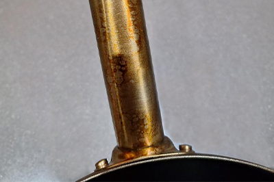 Dit ontstaat vaak door hitte en regelmatig gebruik en hoort bij een pan die met plezier wordt gebruikt! Gelukkig is dit puur cosmetisch en geen invloed op de prestaties. Vind je het storend? Met een sopje en een schuursponsje maak je de steel weer glimmend.