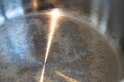 Een teken dat je pan hard heeft gewerkt. Helemaal normaal en geen enkel probleem. Heb je last van watervlekken? Die poets je eenvoudig weg met wat azijn of een reiniger voor roestvrij staal.