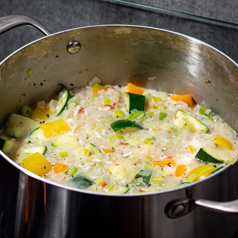 Voeg courgette, paprika en champignons toe en bak deze enkele minuten mee. Meng er een eetlepel Italiaanse kruidenmix door, schenk het water erbij en voeg de risotto rijst toe. Roer goed door.