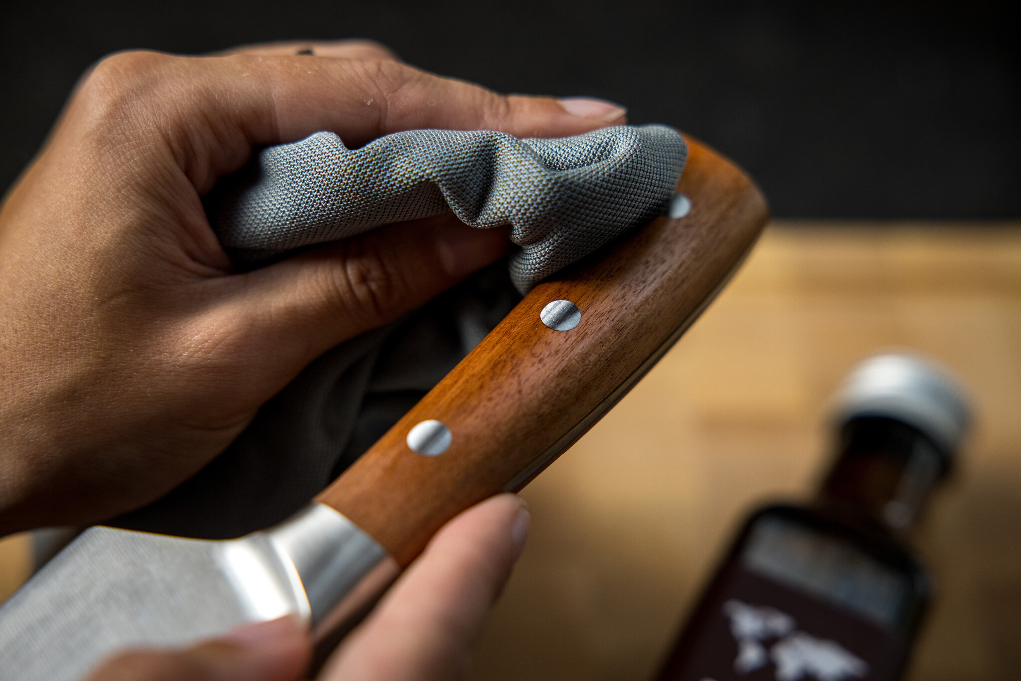 Droog het mes, inclusief het handvat, meteen goed af met een zachte doek. Zo voorkom je vlekken, roestvorming en uitdroging van het hout. - Opbergen