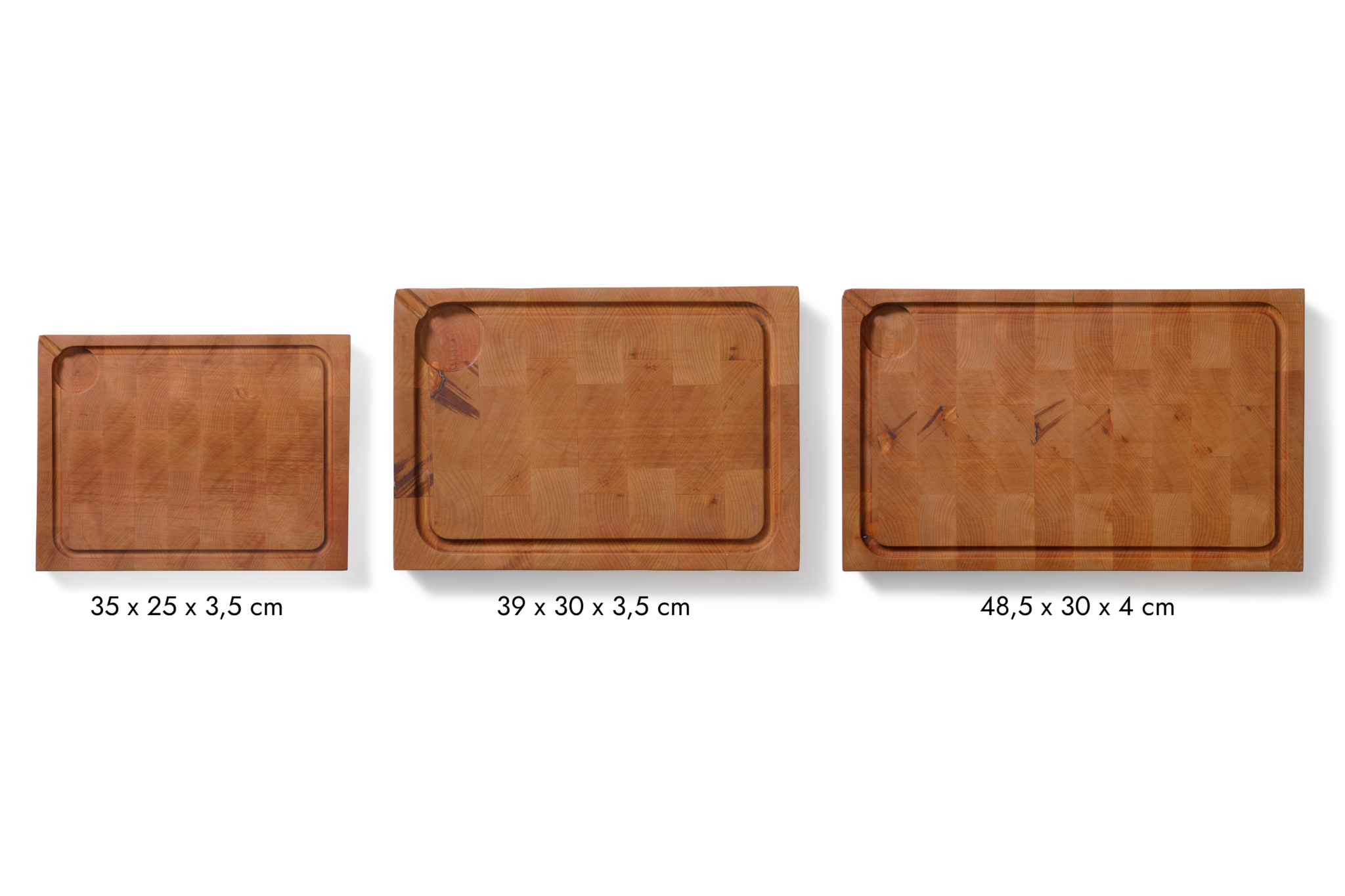 De ene kant van de plank is glad, ideaal om droge ingrediënten op te snijden. Ga je er een kliederboel van maken? Gebruik dan de andere kant. Daar hebben we een geul met reservoir in gefreesd, zodat al het overtollige vocht netjes opgevangen wordt. De zijkanten van deze snijplank zijn voorzien van ingefreesde handgrepen.