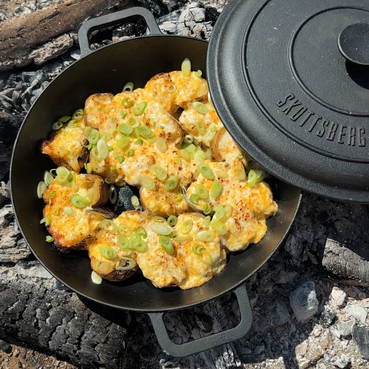 Chcesz prostą, ale pyszną przekąskę, która od razu robi wrażenie? Gotując ziemniaki w skórce, pozostają one jędrne i pełne smaku. Następnie trafiają do cast iron głęboka Patelnia, przykryte mieszanką serka kremowego i startego sera. Udekorowane świeżą dymką, to idealne comfort food na każdą imprezę lub grillowanie.